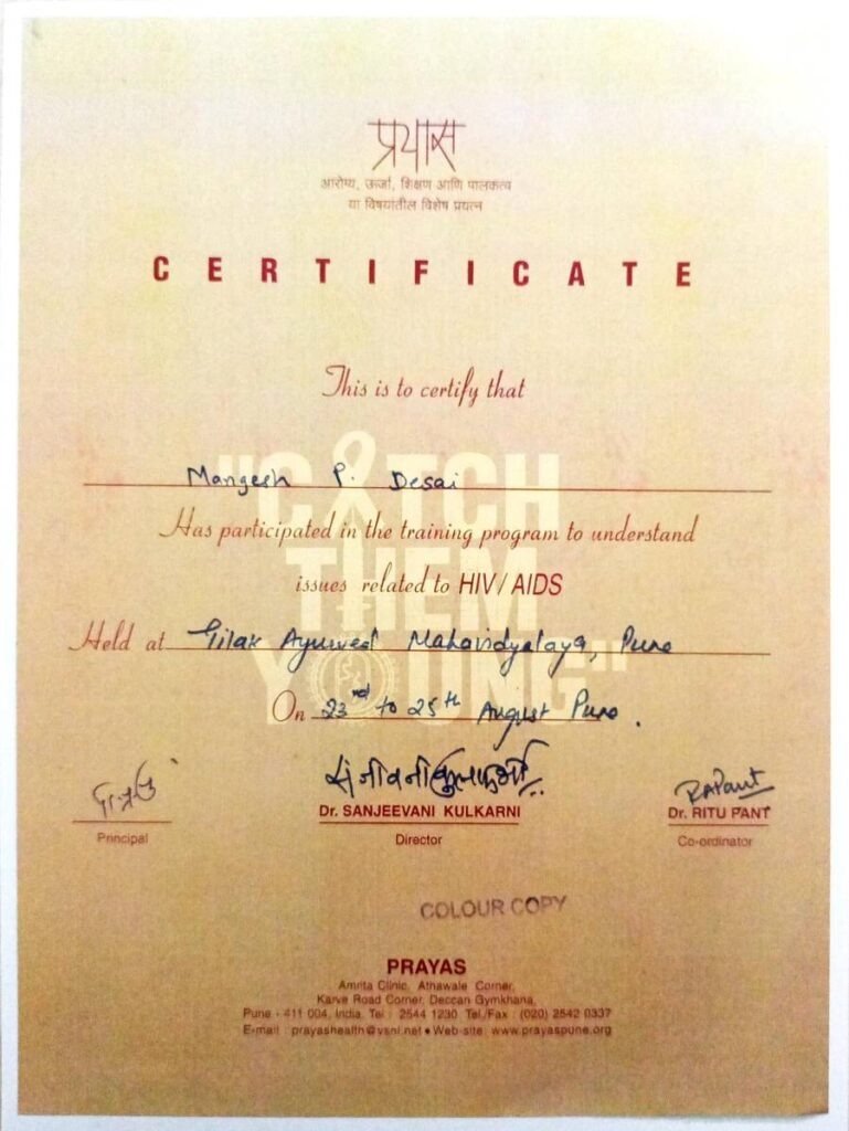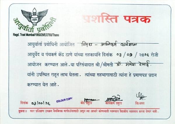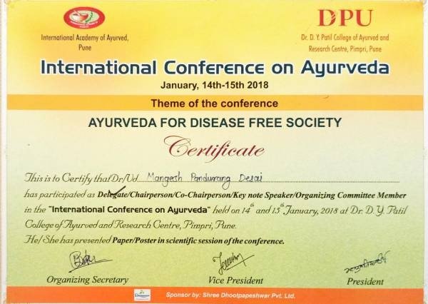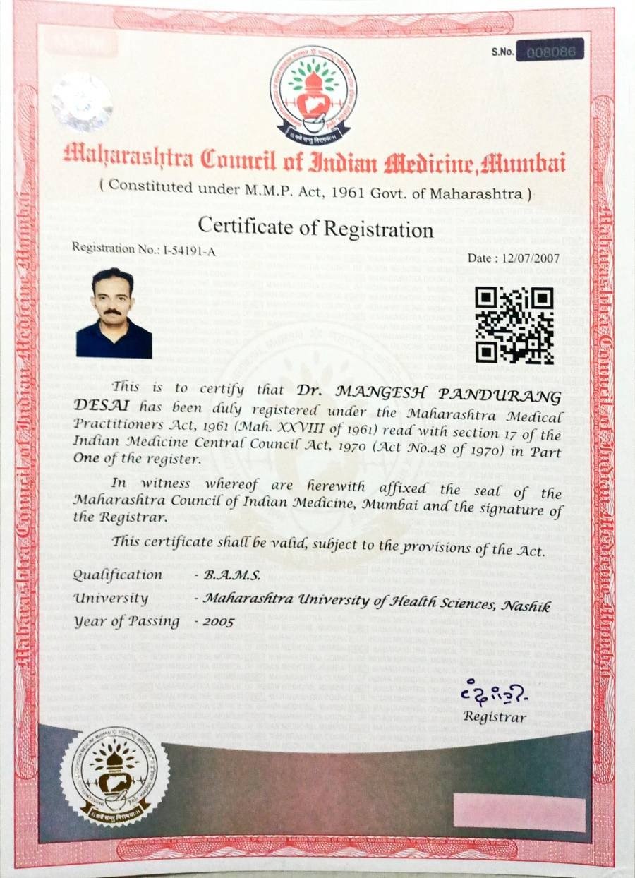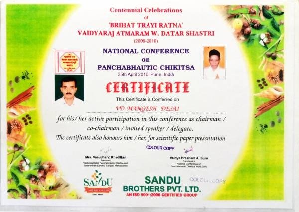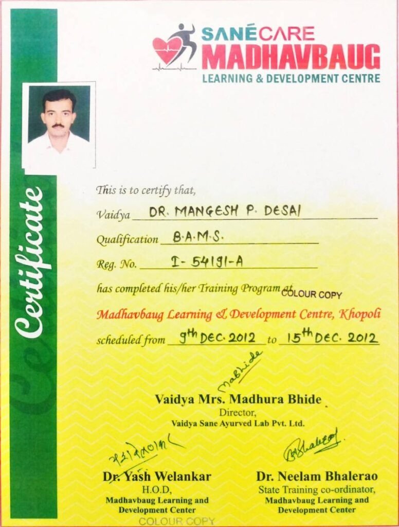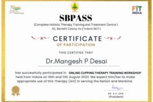 After completing his education, Dr. Mangesh P. Desai completed a course in self-hypnosis and hetero-hypnosis. He also received training in Panchabhautic Chikitsa, Panchakarma therapies, cupping therapy, and completed a yoga instructor course at Vivekananda Yoga Anusandhana Samsthana, Bengaluru.