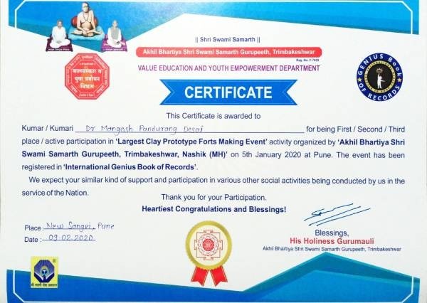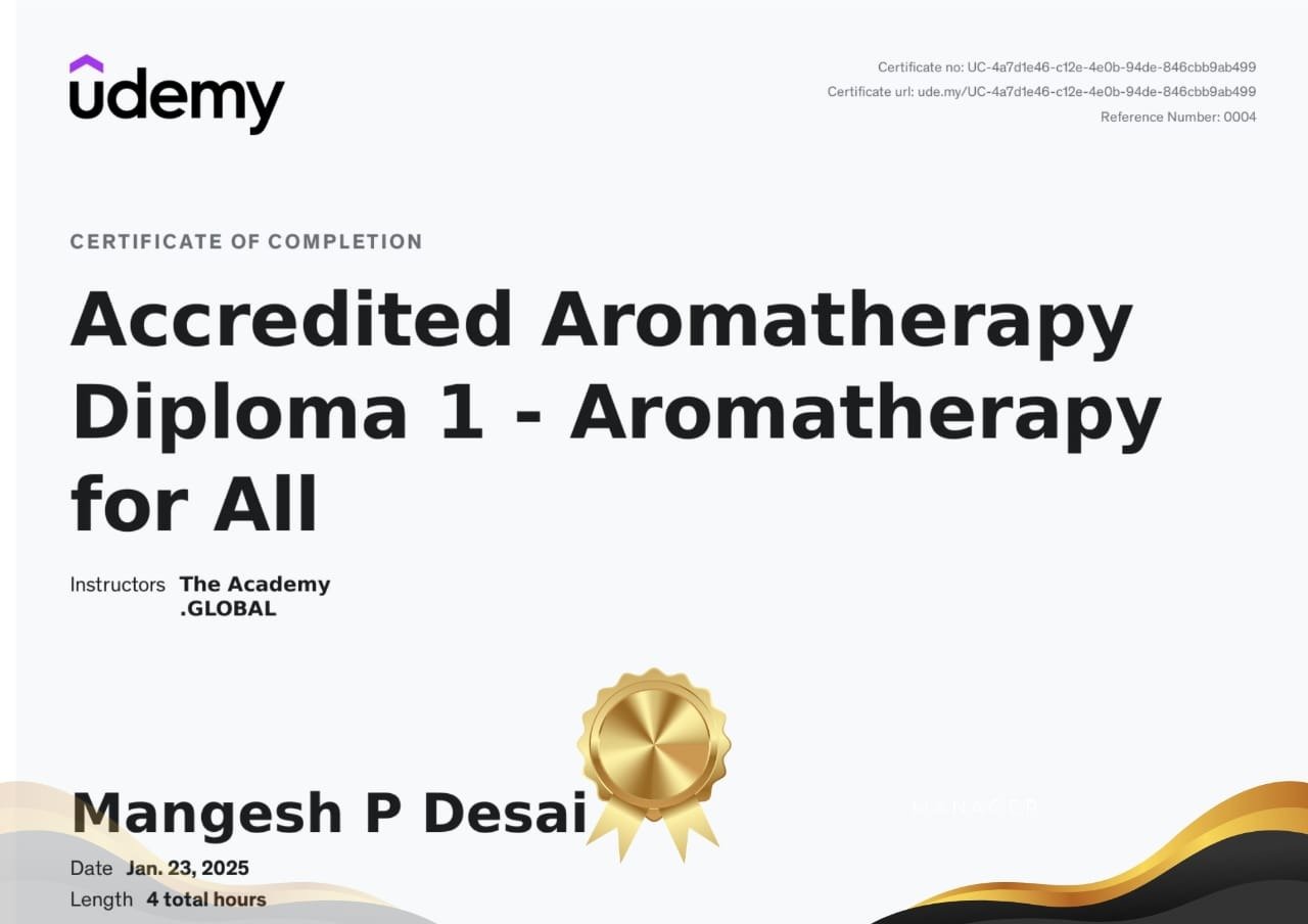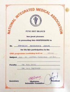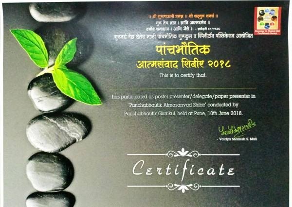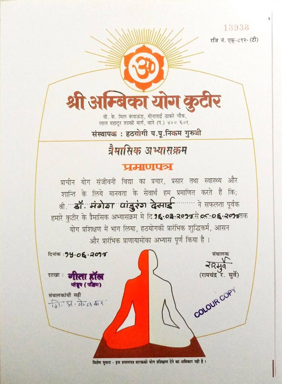 After completing his education, Dr. Mangesh P. Desai completed a course in self-hypnosis and hetero-hypnosis. He also received training in Panchabhautic Chikitsa, Panchakarma therapies, cupping therapy, and completed a yoga instructor course at Vivekananda Yoga Anusandhana Samsthana, Bengaluru.